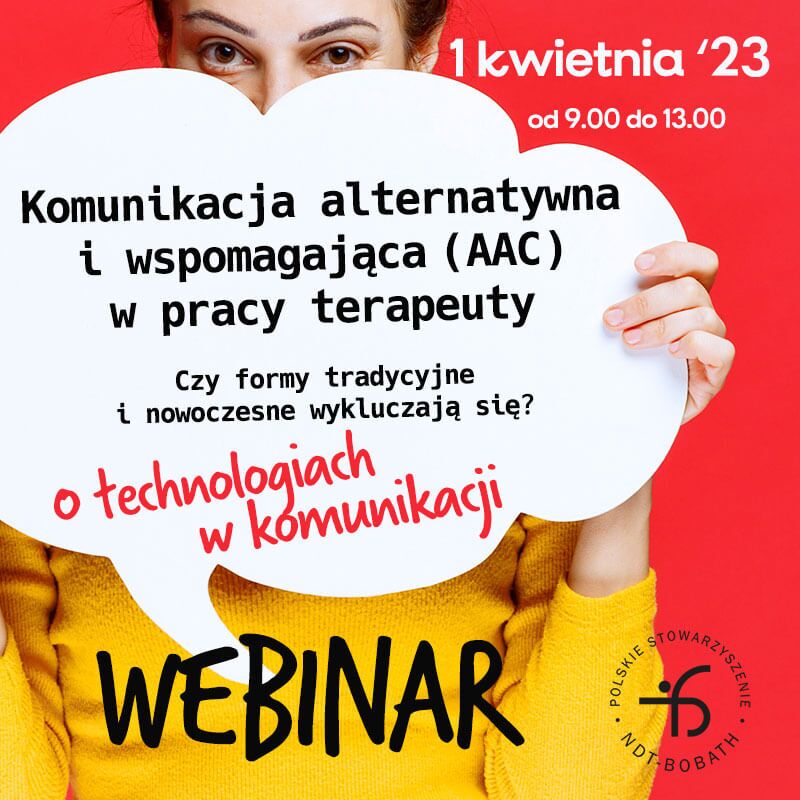 Polskie Stowarzyszenie NDT-Bobath serdecznie zaprasza na webinarium „Komunikacja alternatywna i wspomagająca (AAC) w pracy terapeuty – Czy formy tradycyjne i nowoczesne wykluczają się ? O technologiach w komunikacji.„, które odbędzie się w poprzez platformę Zoom w dniu 01 kwietnie 2023 roku.